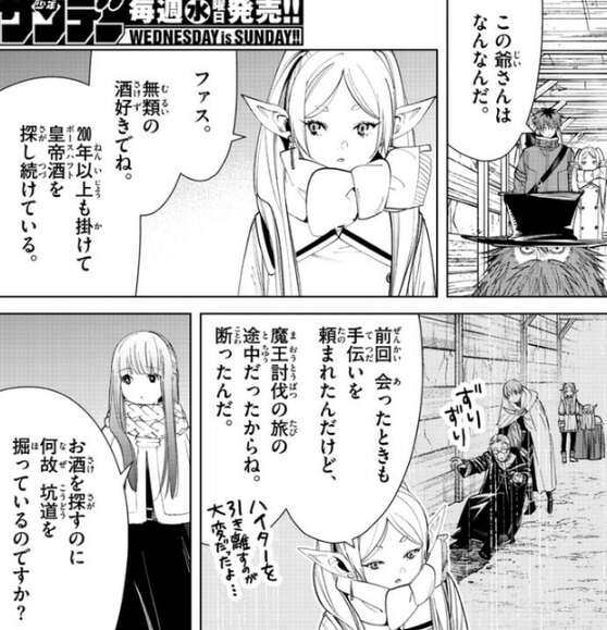 ファスはフリーレンに皇帝酒(ボースハフト)の所在が分かったと言い、ファスが掘った坑道に来るように言います。ファスは無類の酒好きで、200年以上も掛けて皇帝酒(ボースハフト)を探し続けていました。そして、ファスはこの地下で皇帝酒(ボースハフト)を貯蔵した遺跡を見つけました。