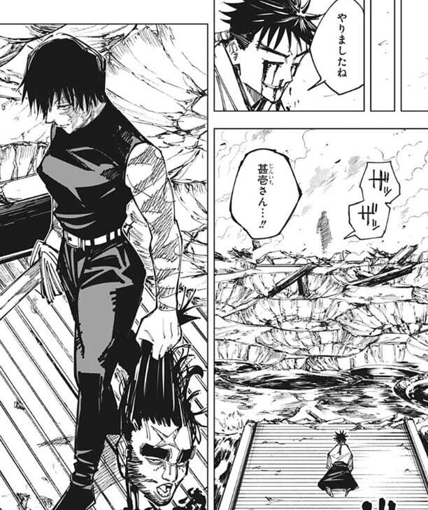 蘭太は甚壱の勝利を確信し、術式を破られた影響で目から血を流して何も見えないようですが、やりましたね、甚壱さん…!!と、歩いてくる人影に話しかけます。しかし、歩いてくる人影の正体は真希で、甚壱は真希に殺されていて真希は手に甚壱の首を持っていました。