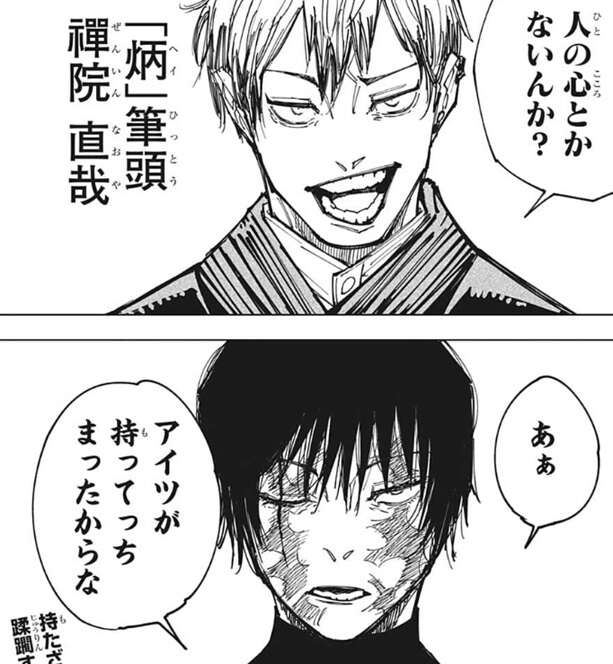 真希は甚壱の首を池に投げ捨てますが、そこに「炳」筆頭の直哉が現れます。直哉は真希に、人の心とかないんか?と、言いますが、あぁアイツが持ってっちまったからな、と真希は答えます。