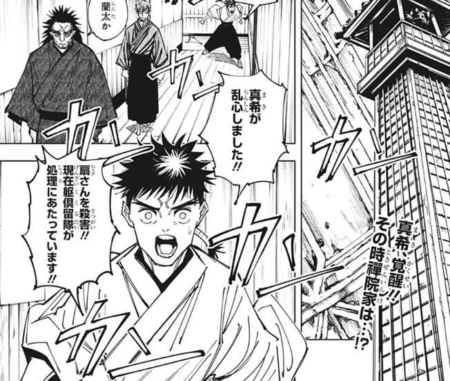 一方、禪院家屋敷では真希が乱心し手扇を殺害した、と警鐘が鳴り響いていました。直哉と甚壱の所に蘭太が現れて、真希は現在躯倶留隊が処理にあたっていると報告します。