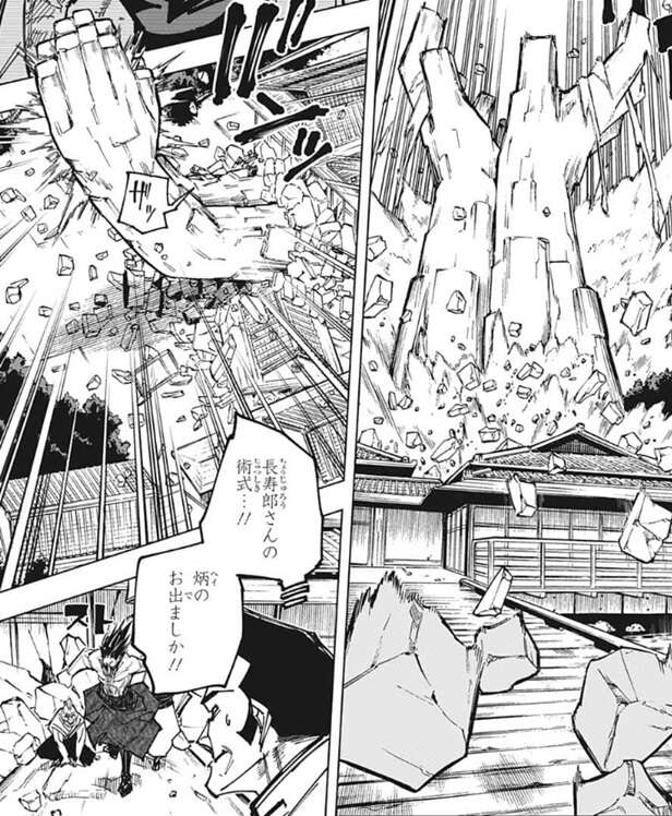 次の瞬間、強大な手が突然現れ真希は強大な手によってつぶされてしまいます。この強大な手は「炳」の長寿郎の術式でした。