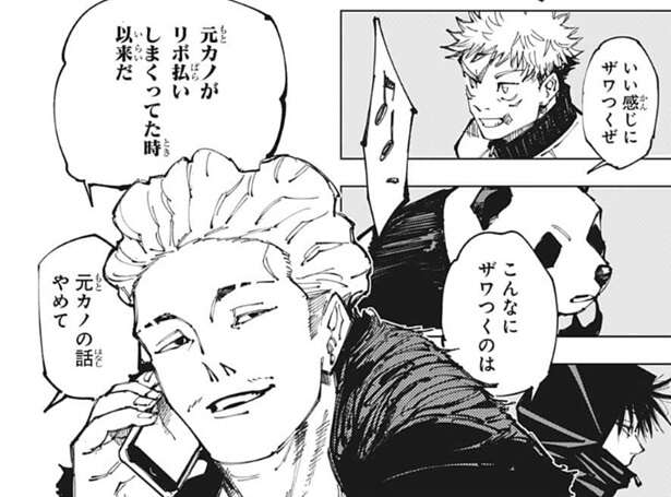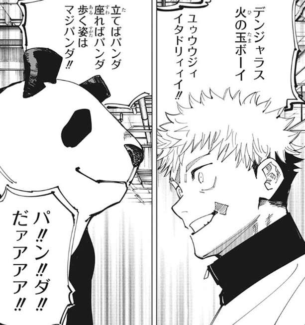 賭け試合が始まると、虎杖とパンダは互角の殴り合いを繰り広げます。殴り合いをしながらも、虎杖とパンダは密かに会話をしてお互いの状況を確認します。パンダは秤にはまだ会えていないようで、星綺羅羅の術式によって避けられているようです。パンダは虎杖が高専生であることを隠していると確認すると、わざと虎杖のパンチをくらいます。