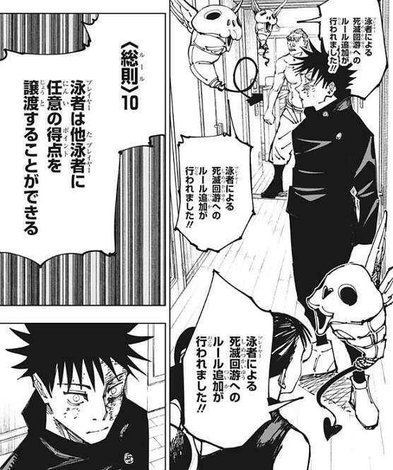 その時、コガネからプレイヤーによる死滅回游へのルール追加が行われた、とのアナウンスがあります。ルール追加の内容は、プレイヤー間での任意のポイントの譲渡を可能にするというもので、伏黒は虎杖がやってくれたと直感し、自然と笑みがこぼれます。
