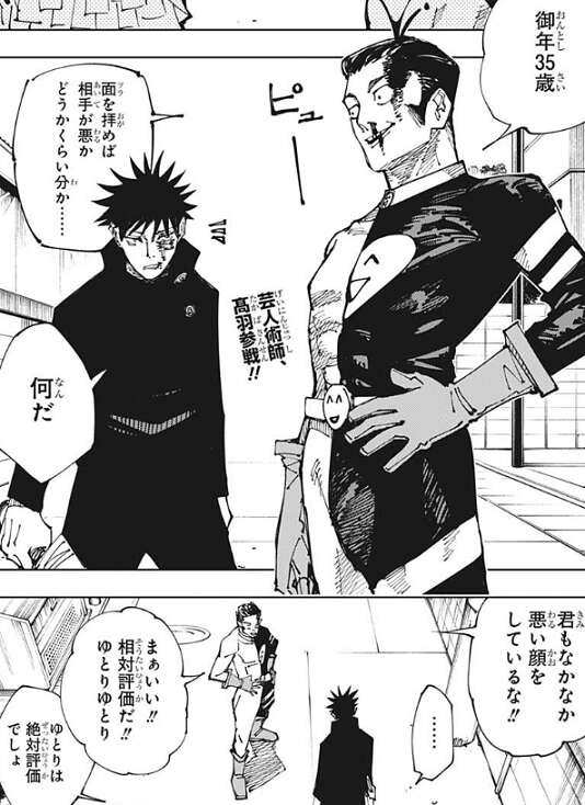 突然、乱入してきた髙羽史彦は伏黒を助けると、助太刀すると言ってきます。面を拝めば相手が悪いかどうかくらい分かる…、と言いかけますが、伏黒に、君もなかなか悪い顔をしてるな!!と言ったり、相対評価だ!!ゆとりゆとり、といい加減なことを言ったり、いまいち伏黒の味方かはっきりしません。