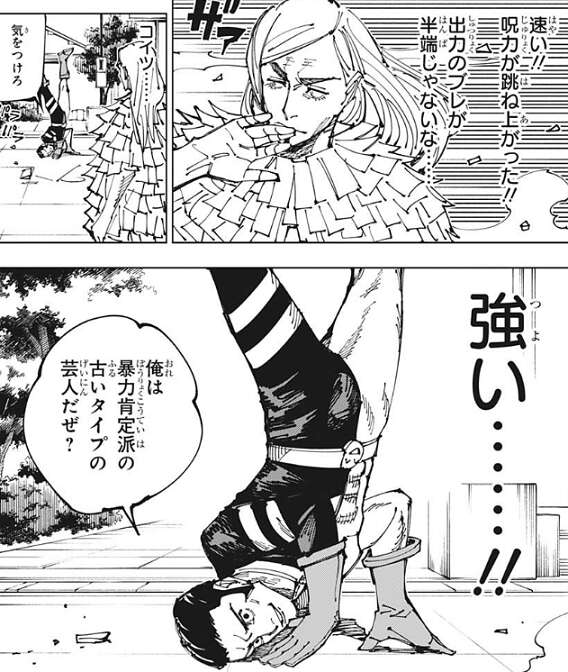 髙羽は伏黒の願いを引き受けつつも、芸人だから人から一生笑顔を奪う真似はせん!!と、言い黄櫨は殺さないことを伝えます。伏黒は、勝ってくれれば、なんでもいい、と言い残すと、レジィに方に向かいます。それを聞いていた黄櫨は、自分の眼球を取り出すと髙羽に向かって勢いよく投げつけます。