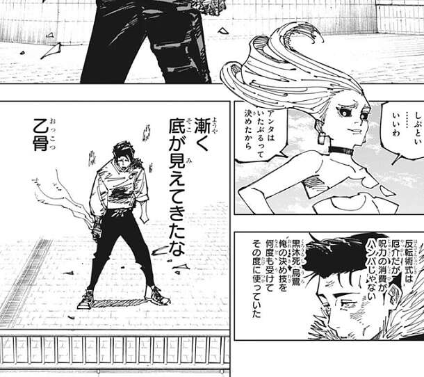 自分の攻撃を跳ね返されて、石流は自分の技を食らってしまいます。一方、建物に叩きつけられた乙骨は、立ち上がり反転術式を自分に使用します。その様子を見ていた石流は、反転術式を何度も使い呪力の底が漸く見えてきた、と考えます。