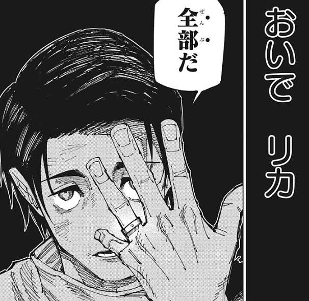 乙骨の底が見え始めガッカリしたのか、……オマエじゃなかったのか、と石流は乙骨につぶやきます。一方、石流と烏鷺を一般市民のいるスタジアムからもう少し離したかった、と乙骨は考えます。しかし仕方がないと考え、おいで、リカ、全部だ、と乙骨は言うと指輪をかざしリカを呼び出します。