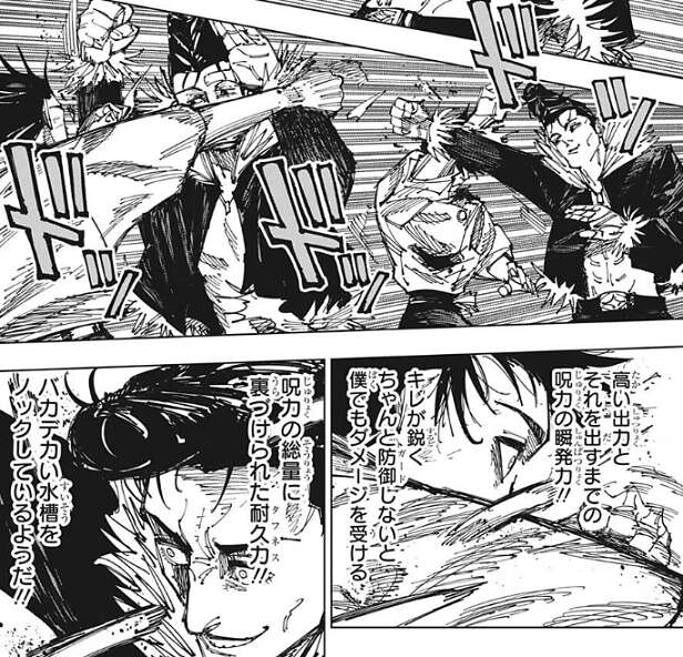 石流のキレの鋭い攻撃に驚きながらも、乙骨は攻撃をガードします。一方、石流も乙骨の呪力の総量に裏づけられたタフネスさに驚きながらも、次々と体術による攻撃を繰り出します。