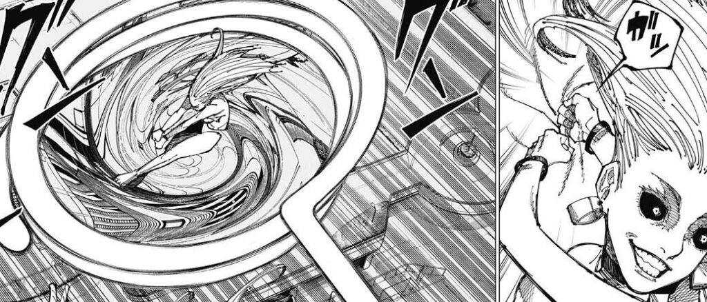すると、乙骨との戦いを邪魔された石流がブチギレて、烏鷺を攻撃します。しかし、烏鷺は空間を歪めると石流の攻撃を受け止め、自分の回りで石流の攻撃を何度か回転させると、石流に跳ね返します。前回、烏鷺が早く撃ってこいよ、と乙骨の攻撃を心の中で誘っていましたが、乙骨の攻撃も跳ね返すつもりだったようです。