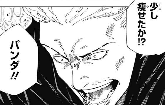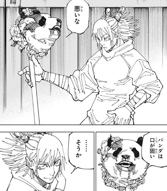 そして、パンダの頭部を鹿紫雲一は杖のような武器で持ち上げますが、悪いな、パンダは口が堅い、とパンダは言い、宿儺の事や虎杖の事を喋ろうとしません。それを聞いた鹿紫雲一は、パンダに止めを刺そうとします。