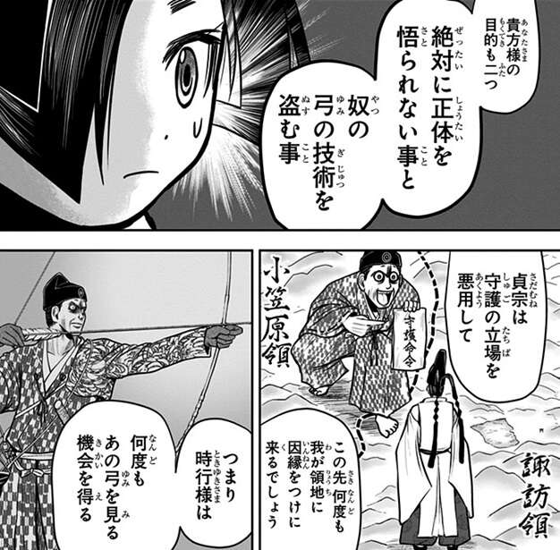 時行は貞宗の行いを武士として恥ずべき行いと軽蔑しますが、貞宗の弓の技術だけは素直に称賛します。素直で寛容な時行の様子を見た頼重は、時行に素性を隠しつつ貞宗の弓の技術を盗むことを提案します。