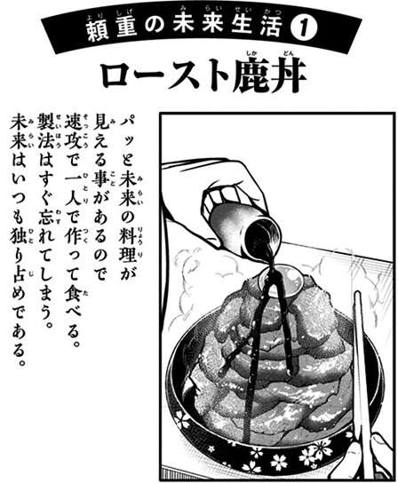 不完全ながらも未来を見通す能力を持つ頼重は、ちょいちょい未来の料理を速攻で作って一人で食べています。第5話でもロースト鹿丼を一人で作って食べていますが、製法はすぐ忘れてしまうそうです。だから時行や逃若党も未来の料理は食べる事は出来ません、未来はいつも頼重が独り占め…。