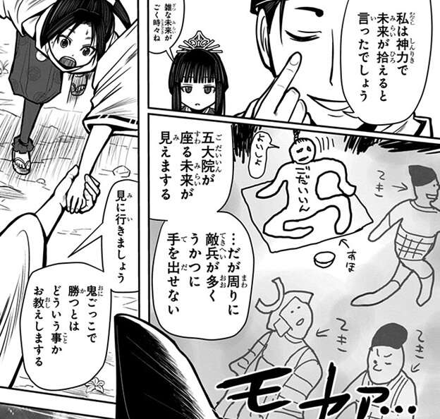 頼重に匿ってもらい高氏を打倒し天下を取り返す決意をした時行ですが、まだ鎌倉を脱出出来ずにいました。時行は鎌倉の出口の監視が緩むまで廃屋に隠れていましたが、兄の邦時が捕まって斬首されたと聞きショックを受けます。邦時を裏切って敵に密告したのは叔父の五大院で、頼重は、鬼ごっこで勝つとはどういう事か兄の敵討ちで教える、と時行に言います。