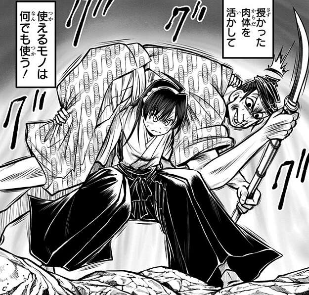 貞宗の追及を躱した時行と亜也子ですが、館からの帰り際に貞宗の評価を落とされて激怒した新三郎に襲われてしまいます。時行の身を守ろうとする亜也子は、授かった肉体を活かして力任せに新三郎を投げ飛ばします。そして、亜也子はとどめに新三郎の首をポロリさせようとしますが、さすがに時行に止められてしまいます。