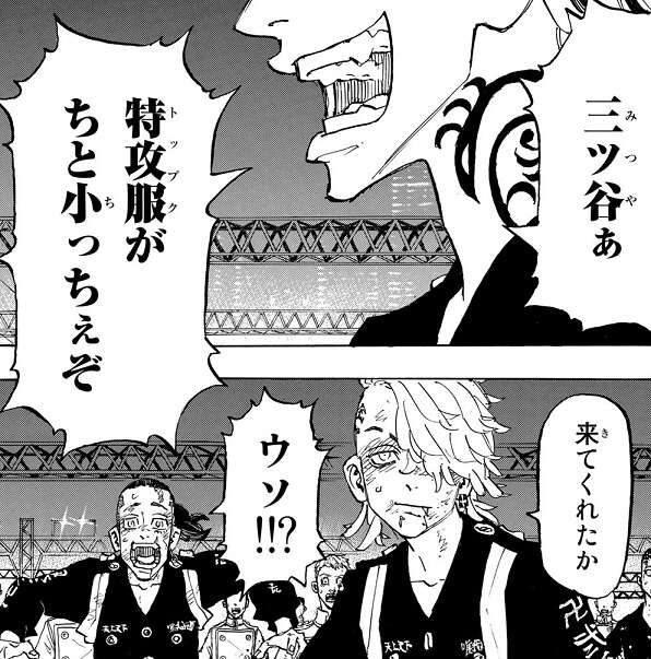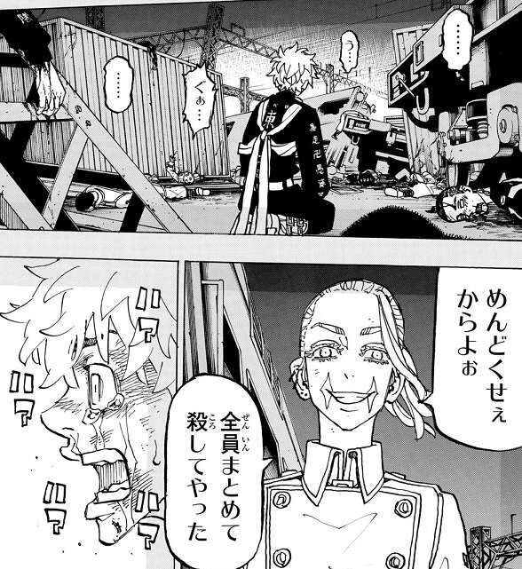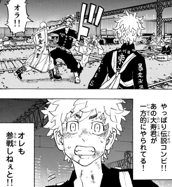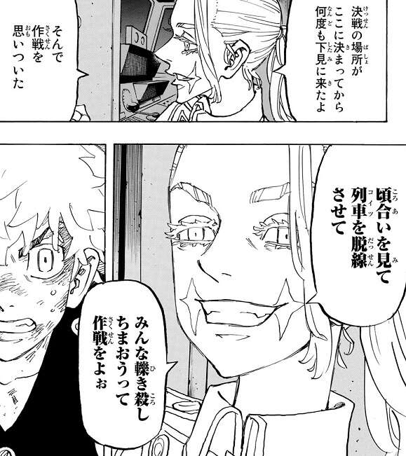 武道と鶴蝶は列車を暴走させようとしていた三途を見つけますが、三途は列車を暴走・脱線させる作戦を止めようとはせず、武道を殺そうと刀で襲い掛かってきます。鶴蝶は武道をかばって三途の刀での攻撃から助けますが、三途は鶴蝶も斬り殺そうと襲い掛かってきます。