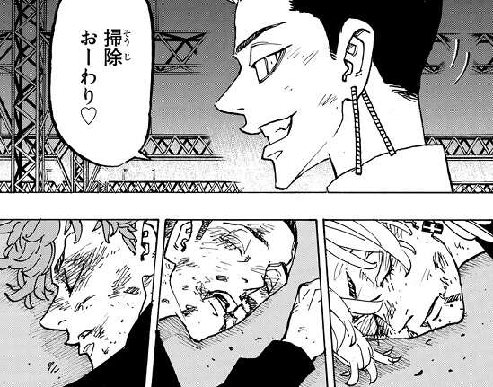 タイマンの末にパーちんはマイキーにやられてしまい、また三ツ谷、八戒、千冬、千堂の四人も半間修二にやられ、二代目 東京卍會で戦るのは残りわずかとなってしまいます。さらに、今牛若狭と荒師慶三戦っていた乾青宗と九井一も、一歩及ばず関東卍會に敗れてしまいます。二代目 東京卍會の敗戦が濃厚となる中、武道は線路に触れた瞬間、皆が列車にひかれる未来視(ビジョン)を見ます。