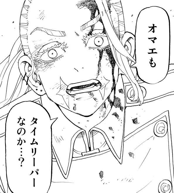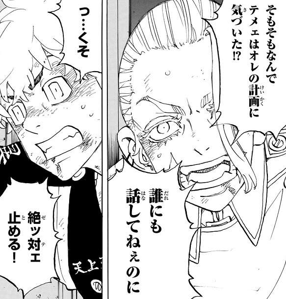 鶴蝶が三途をスパナで殴って足止めし、武道は列車のブレーキを探しますが、ブレーキを見つけられず武道は焦ります。その時、武道は自分が三途に刀で刺されるビジョンを見ます。直前にビジョンを見たおかげで武道は何とか三途の刀を避けれましたが、完全な死角からの攻撃を直前で避けられた三途は、オマエもタイムリーパーなのか…?と、つぶやきます。