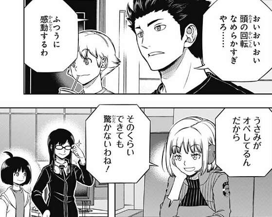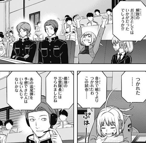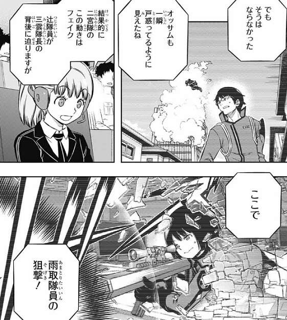 雨取は三雲に命令を聞かなくてごめんなさい…、と謝りますが、三雲も雨取のふつうの弾を撃つよ、と言った言葉を信じ切れてなかったのかもしれないことを謝り、同時にピンチに狙撃してくれた事にありがとうと感謝します。もしここで、雨取が辻を撃ち落とせていなければ、三雲がやられて「隠し玉」の追尾弾(ハウンド)も不発に終わっていて、今回の三雲の劇的な勝利も、実はかなり紙一重だったことが分かります。
