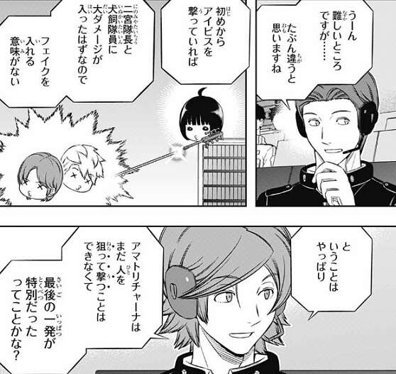 もう一つのポイントは、雨取のアイビスでの狙撃で辻を撃ち落とすことができ、三雲が辻にやられる事を防いでいます。雨取は人を普通の弾で撃つことが出来ませんでしたが、まだ狙って撃つことは出来ないようです。最後のアイビスの一発は特別で、三雲のピンチだったから撃てたようです。