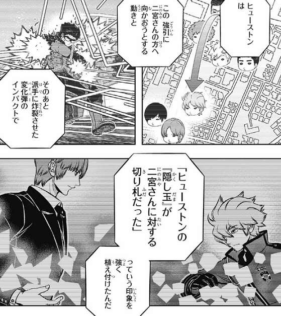 その後、雨取の遠距離からの爆撃が外岡の狙撃で阻止され、ヒュースは包囲からの脱出を試みますが失敗していますが、ここがポイントだと王子は言います。ヒュースが強引に二宮の方に向かおうとする動きと、派手に炸裂させた変化弾(バイパー)のインパクトでヒュースの隠し玉が二宮に対する切り札だった、という印象を強く植え付けています。これで、三雲が隠し持ったもう一つの切り札からみんなの意識を逸らせています。