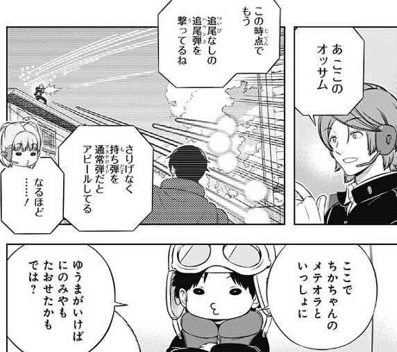 弓場と二宮隊の戦いの場面では、雨取が爆撃と射撃で介入していますが、この時点で三雲が犬飼を追尾なしの追尾弾(ハウンド)で攻撃しています。ここでさりげなく持ち弾を通常弾(アステロイド)だとアピールしています。ここで陽太郎が雨取のメテオラと一緒に、空閑が二宮隊の所に行けば二宮を倒せたかもでは?と口にします。
